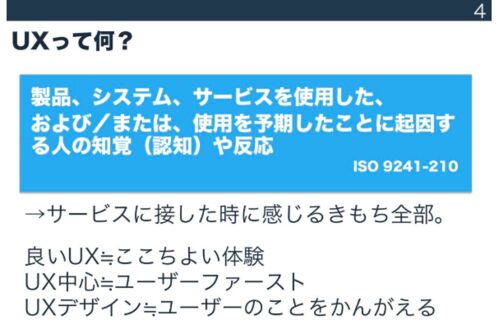 「アプリ開発のためのUX講座」という動画講座がとても面白かったので、学んだ事や感想をまとめてみました。 動画はSchooの有料会員限定ですが、資料は下URLから見る事ができます。 schoo.jp そもそもUXってなにか? 授業で初めて知ったんですが、実はUXはISO…