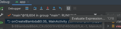 ブレークポイントを有効にするには、いつもの実行ボタンではなくデバッグボタン(虫マーク)でアプリを起動する必要があります。